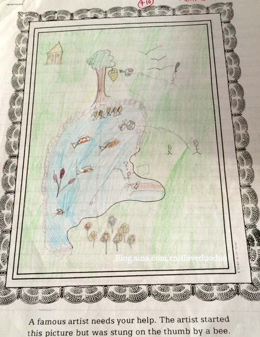 多多这次题为"Amazing Day"的额外作业得了10分(最高分),他把踢球,钓鱼和蜜蜂蜂巢很巧妙地串连在一起。人家写完作业的时候感觉特别好,跟我说他自己是个非常有创意的人,构思只用了五分钟。